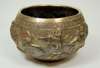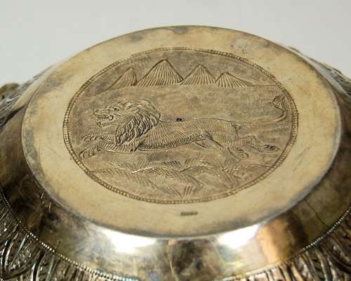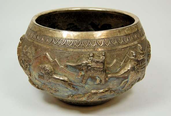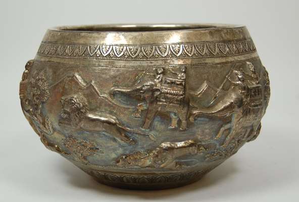 marked to base T.90, the tapered body with high relief embossed decoration of a running hunting scene with arched border above and foliate below, the plain rim with presentation inscription