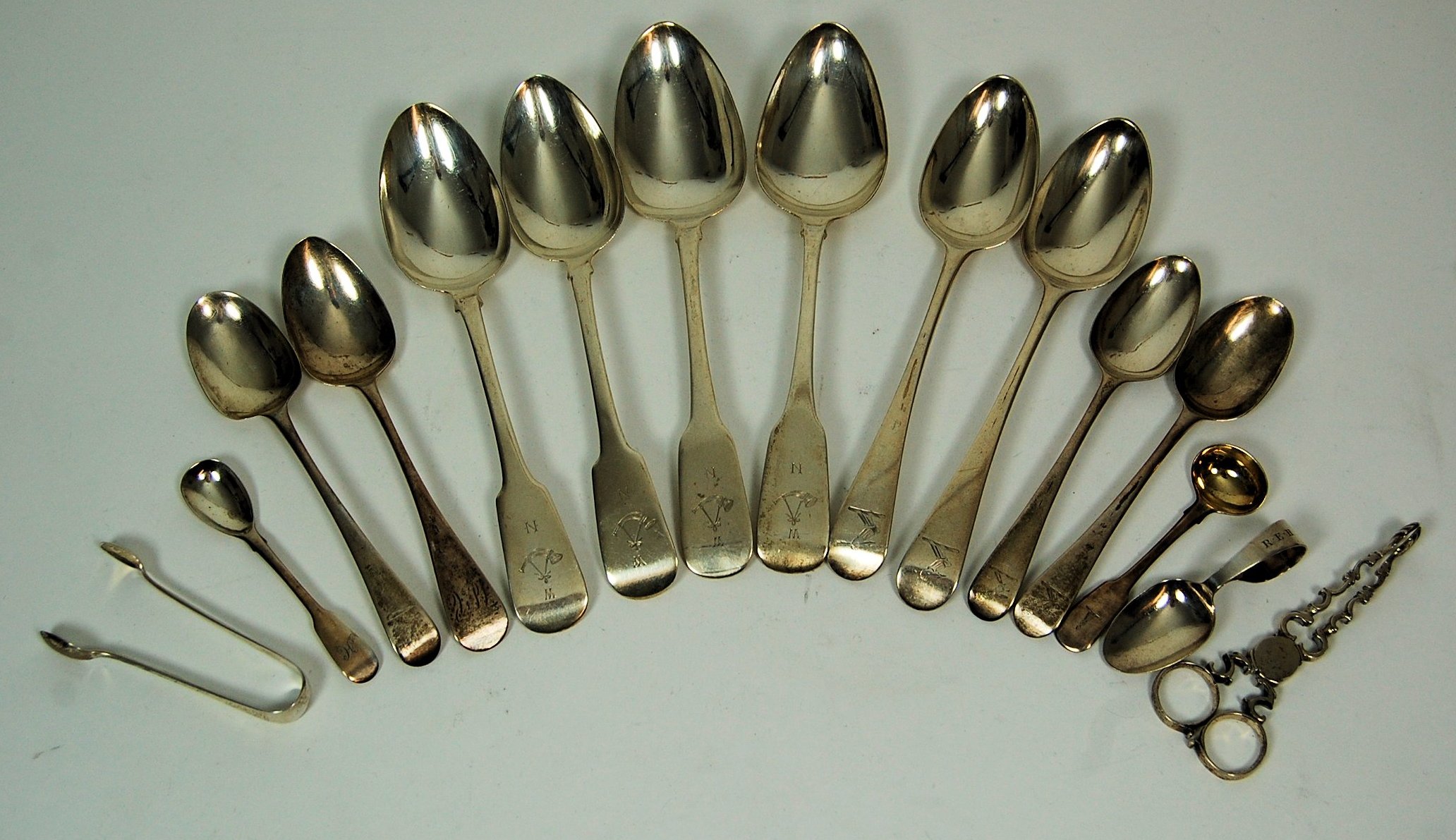 various dates and makers, to include tablespoons, teaspoons, sugar tongs etc (qty)