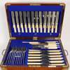 Hamilton & Inches, Edinburgh 1925, comprising twelve tablespoons, table forks, dessert forks, dessert spoons, teaspoons and two sauce ladles, a soup ladle, serving spoon; together with bone handled table knives (one lacking) and dessert knives and a five piece carving set, contained din brass bound fitted two drawer canteen with hinged top