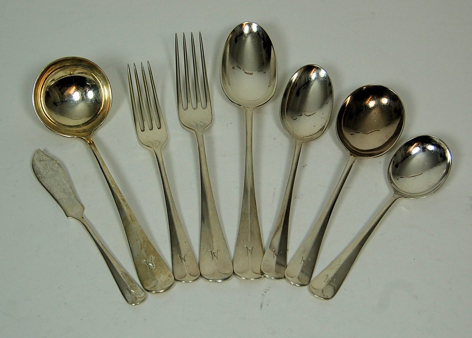 mainly Sheffield 1939, of Hanoverian pattern with rat tails to bowls and engraved initial to terminal, comprising two sauce ladles, four butter knifes, twelve soup spoons, nine dessert spoons, seven dessert forks, six table spoons, thirteen table forks and twelve sundae spoons (qty)