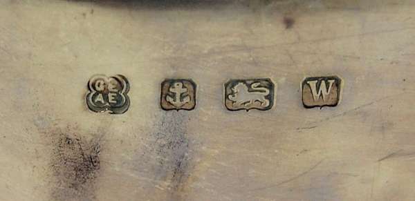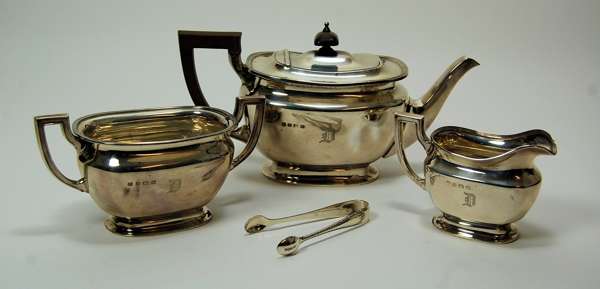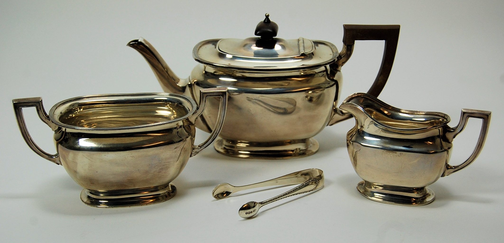 Birmingham 1946, comprising teapot, twin handled sugar bowl and milk jug, each of plain tapered form with reeded rims and simple angular handles; together with a pair of sugar tongs (4)