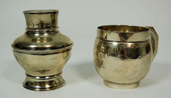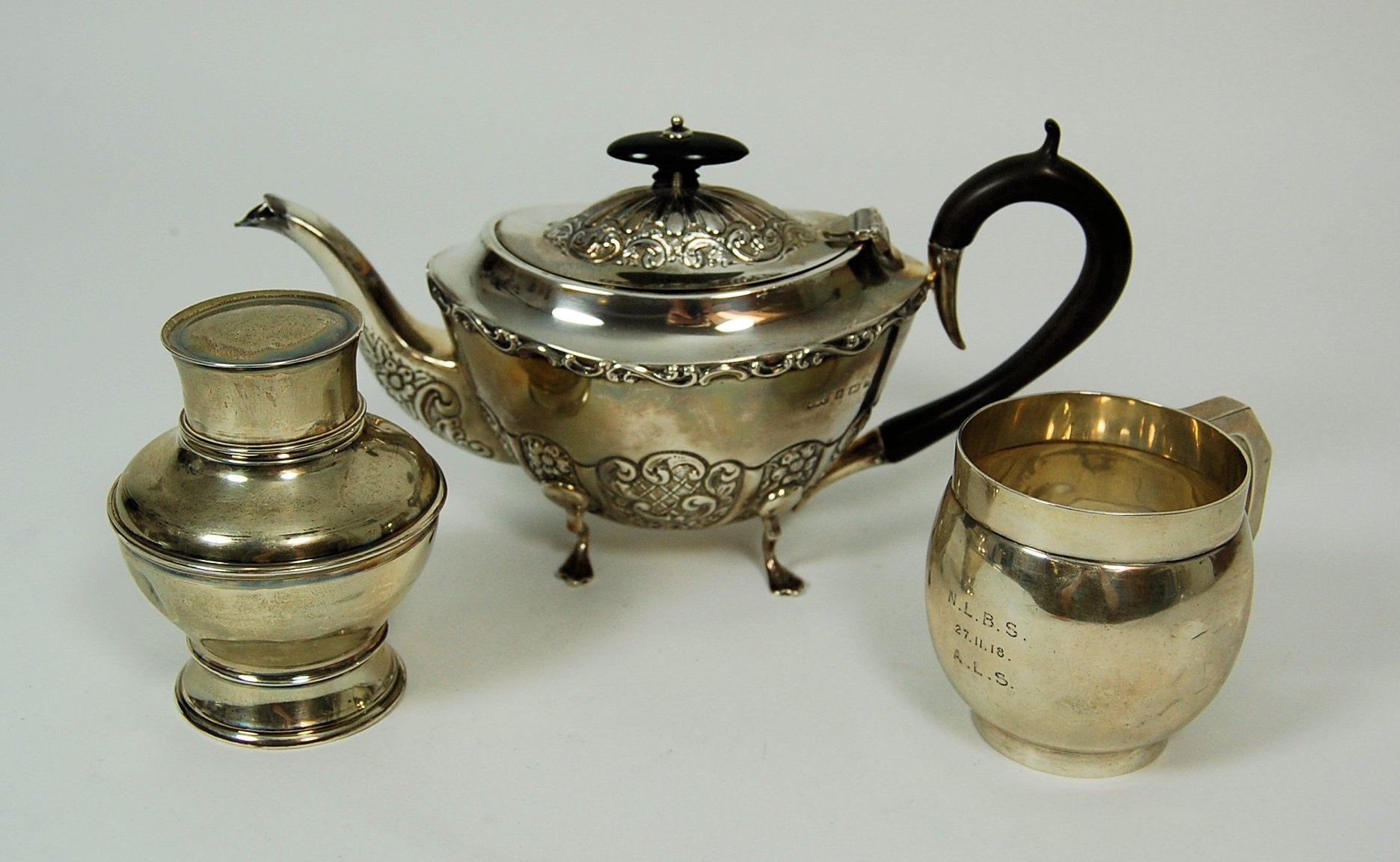 Birmingham 1906, of tapered form with embossed scrolls foliage, with wooden handle and curved spout; together with a modern tea caddy a christening mug (3)