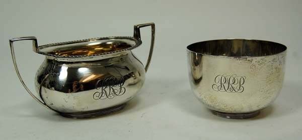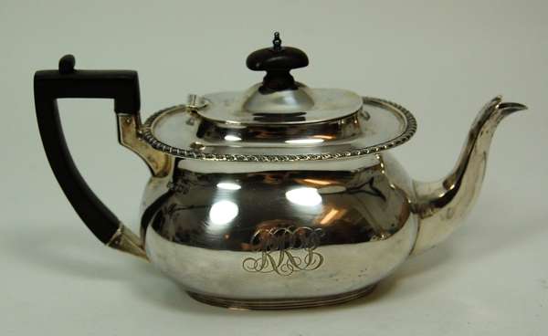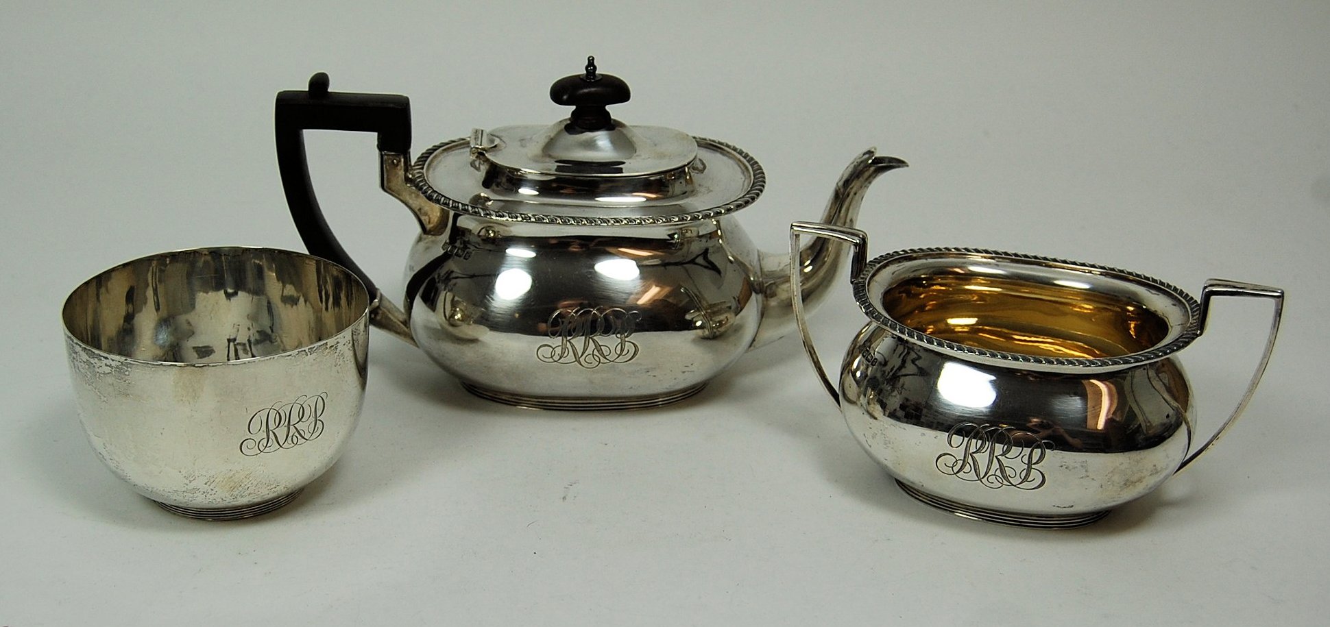 various dates, comprising tea pot and two sugar bowls, the teapot and one sugar bowl of baluster form with gadrooned rims, the other of plain hemispherical form (3)