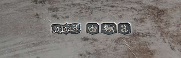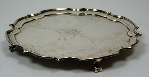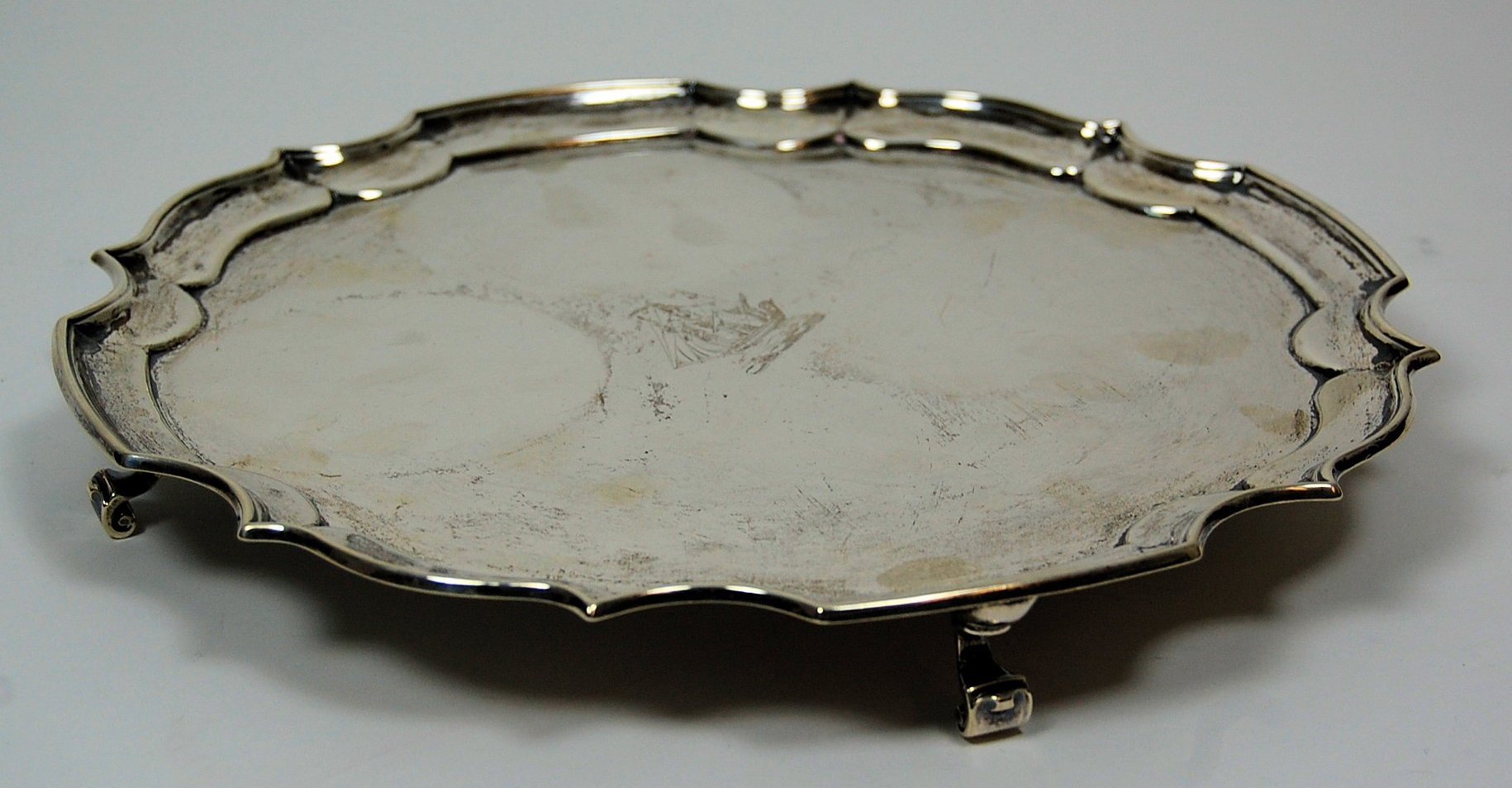 J Dixon & Sons, Sheffield 1918, of shaped circular outline with engraved crest to centre and raised on four scroll feet