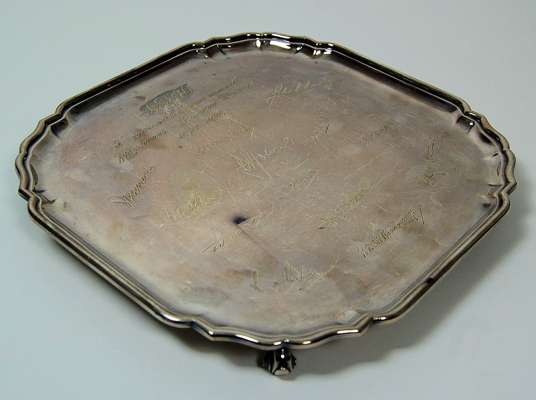 Sheffield 1969, of canted square form with moulded rim and engraved signatures and inscription, raised on four feet