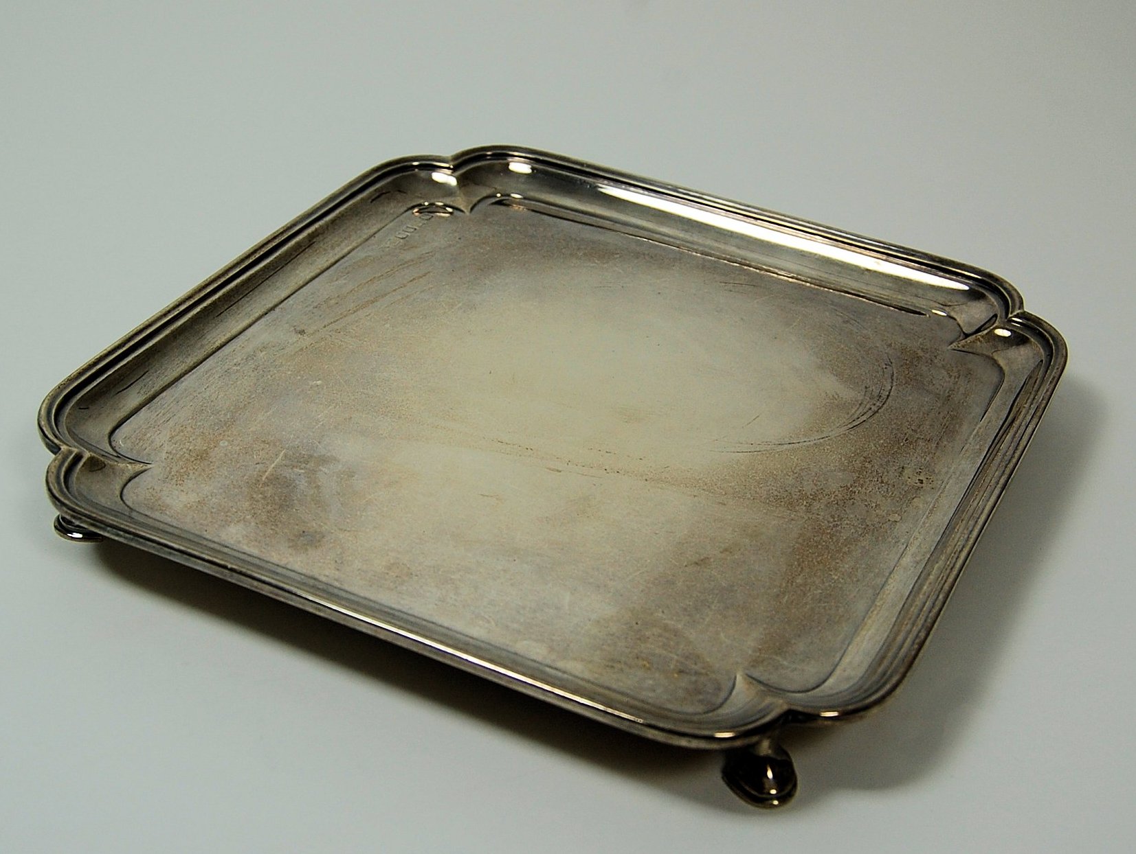 Edwards, Glasgow 1937, of canted square outline with reeded rim and raised on four hoof feet