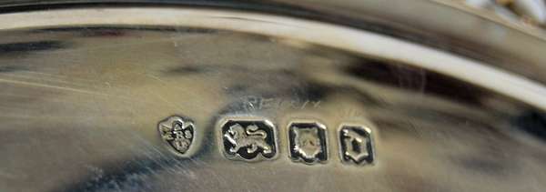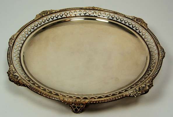 London 1919, of shaped circular outline with gadrooned and foliate border and pierced rim, raised on four bracket feet
