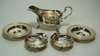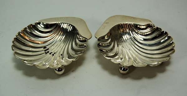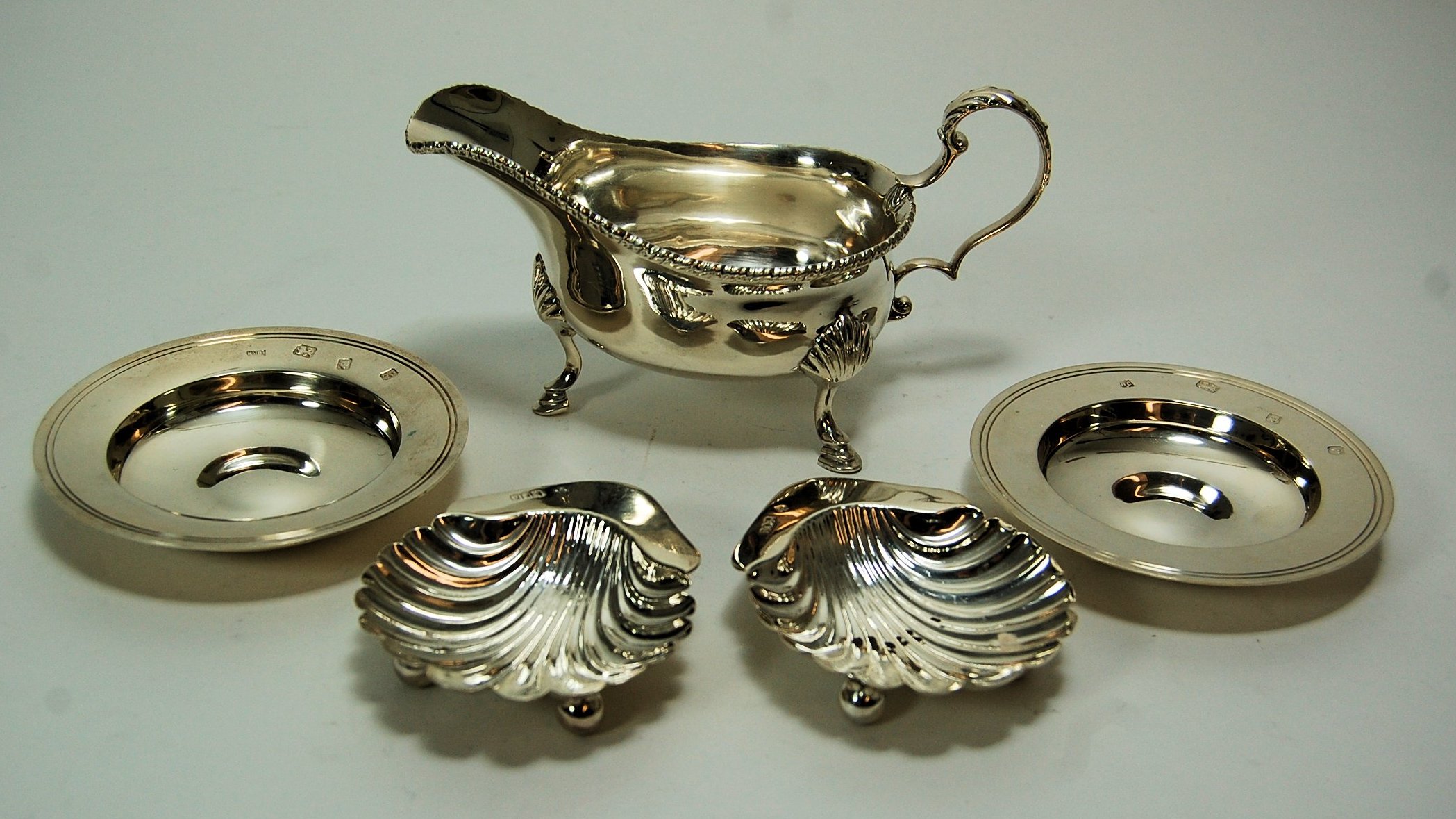 London 1909, of simple baluster form with gadrooned rim and with S scroll handle; together with a pair of modern Armada dishes and two shell butter dishes (5)