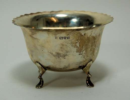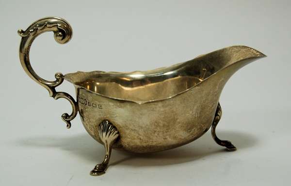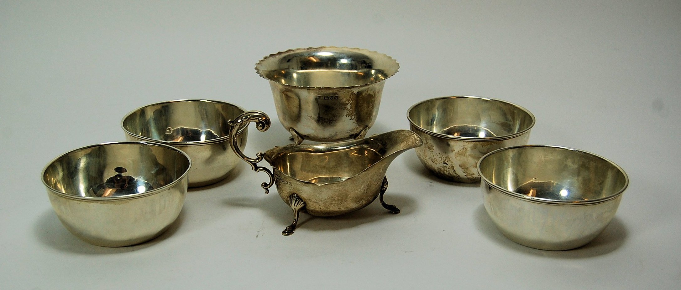 Mappin & Webb, London 1906, of simple form with moulded rim; together with a modern sugar bowl and cream boat with scalloped rim (6)