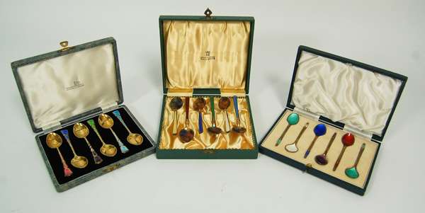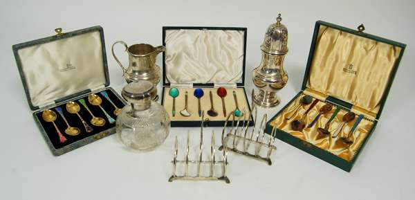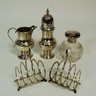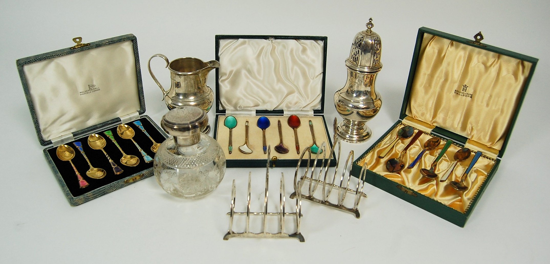 Birmingham 1939, of bellied form with domed stepped foot; together with two silver toast racks; a scent bottle and three sets of cased enamel spoons (qty)