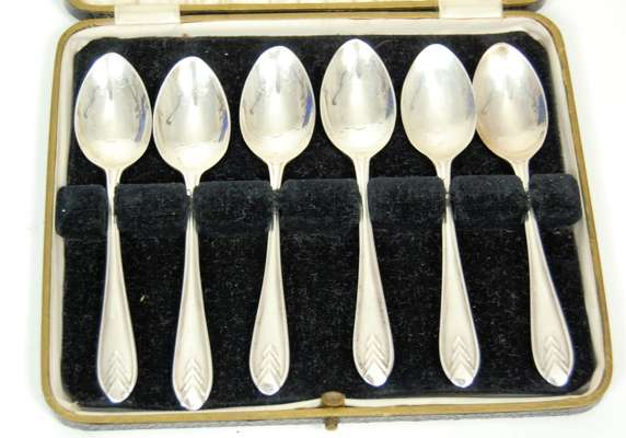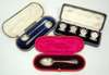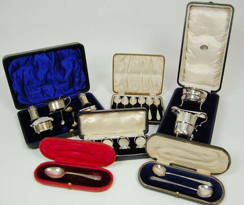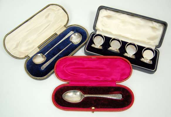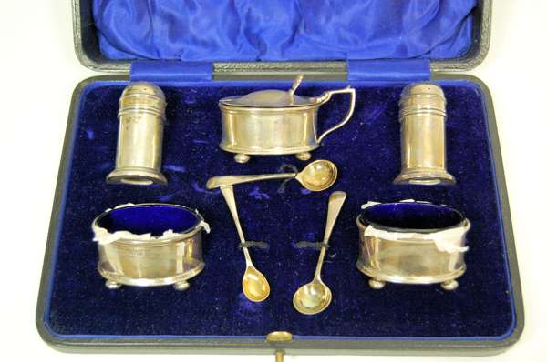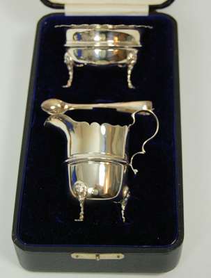 Birmingham 1938, of bellied form with scalloped rims and raised on lion mask hoof feet, in fitted case with tongs; together with a quantity of cased spoons, cruet and menu holders (qty)