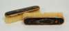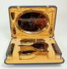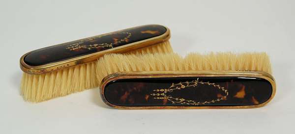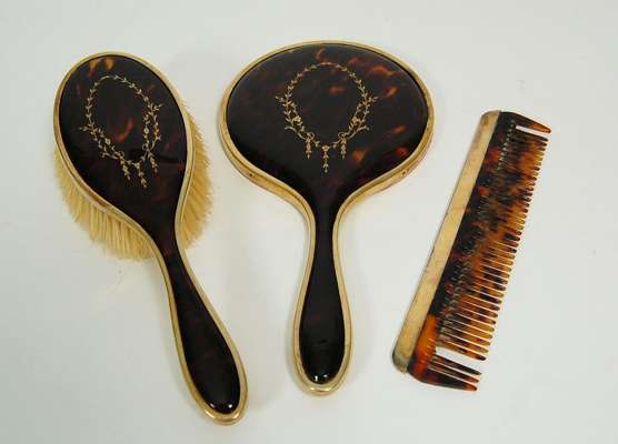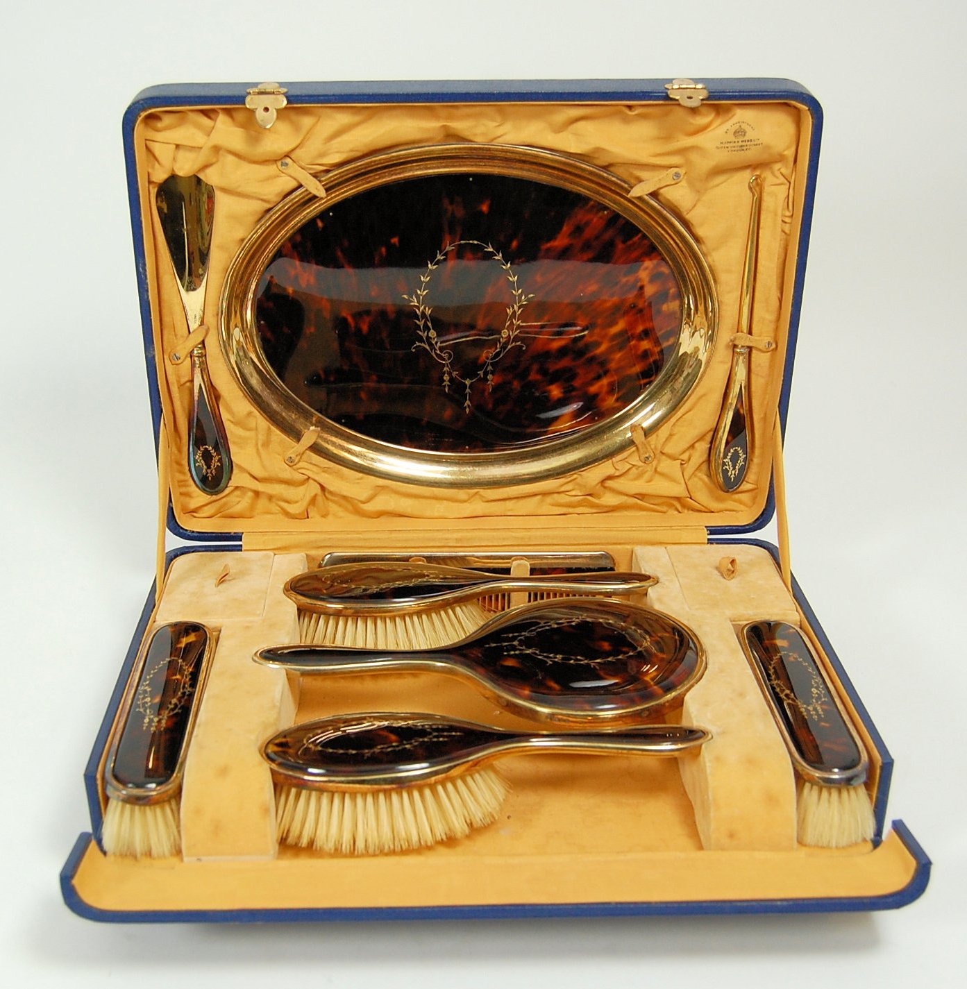 London 1925, comprising tray, shoe horn, button hook, comb, two clothes brushes, two hair brushes and hand mirror, each with simple silver gilt borders and floral garlands inlaid into tortoiseshell panels, in original fitted case