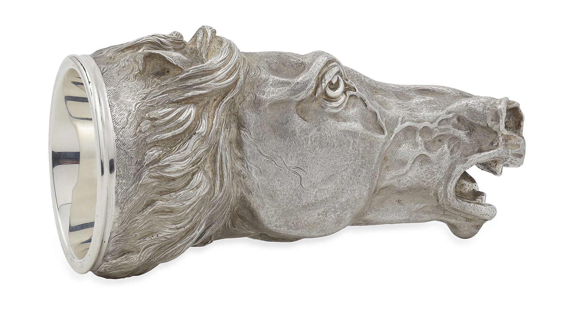 Wakely & Wheeler, London 2012, naturalistically cast as a horse's head with reeded rim and tapered cup within neck