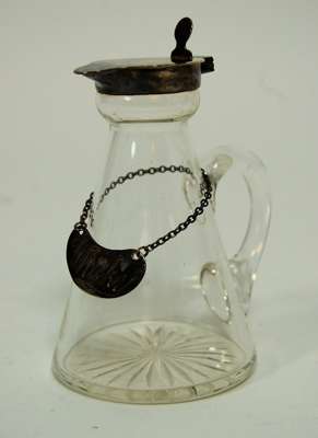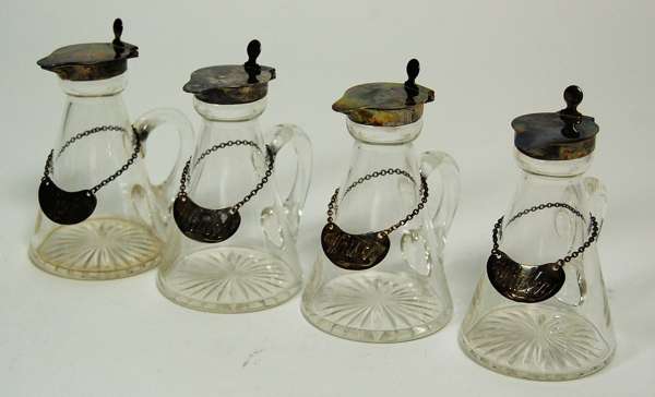 Brook & Sons (of Edinburgh), Sheffield 1929, the glass bodies of conventional form with loop handle, with simple hinged cover and with spirit labels inscribed 'Whisky' (4)