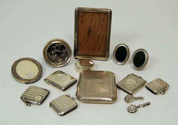 to include various engraved and engine decorated examples, together with a cigarette case; also to include a small group of silver mounted photo frames (qty)