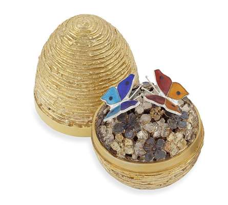 Stuart Devlin London1975, limited edition 40 / 300, the textured gilt egg opening to revel two enamel butterflies on a naturalistic floral ground, in original case with certificate
