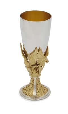 Hector Miller for Aurum, London 1981, limited edition 38/1000, the bowl of plain sliver design surrounded at the stem by three gilt heraldic beasts with displayed wings, the tapering circular foot with gilt floral detail, with original paperwork
