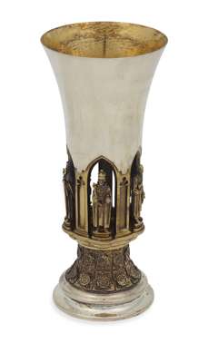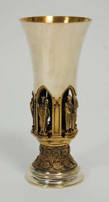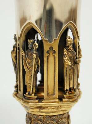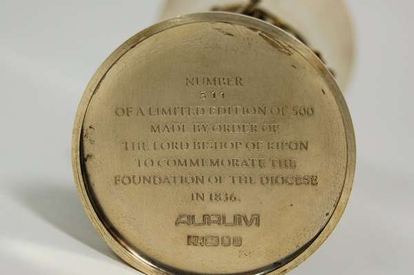Hector Miller for Aurum, London 1986, limited edition 311/500, the bowl of plain design above a pierced gallery of gilt figures of various saints and benefactors specific to the Cathedral, the stem with gilt floral detail above a stepped circular foot, with original paperwork