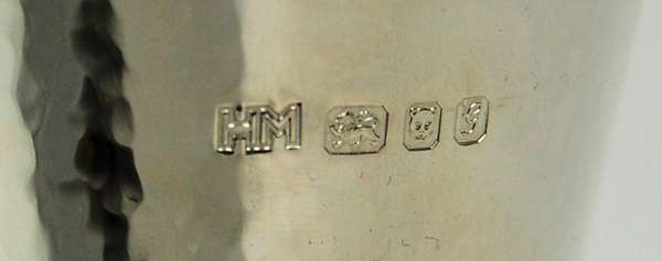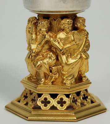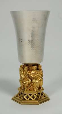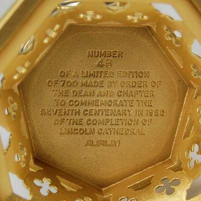 Hector Miller for Aurum, London 1981, limited edition 48/700, the slightly tapering bowl of planished finish above a castle and chased gilt gallery depicting a choir of angels, all on a seven sided pierced foot of quatrefoil decoration, with original paperwork