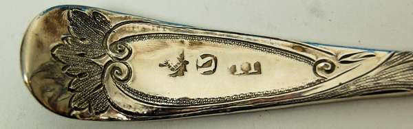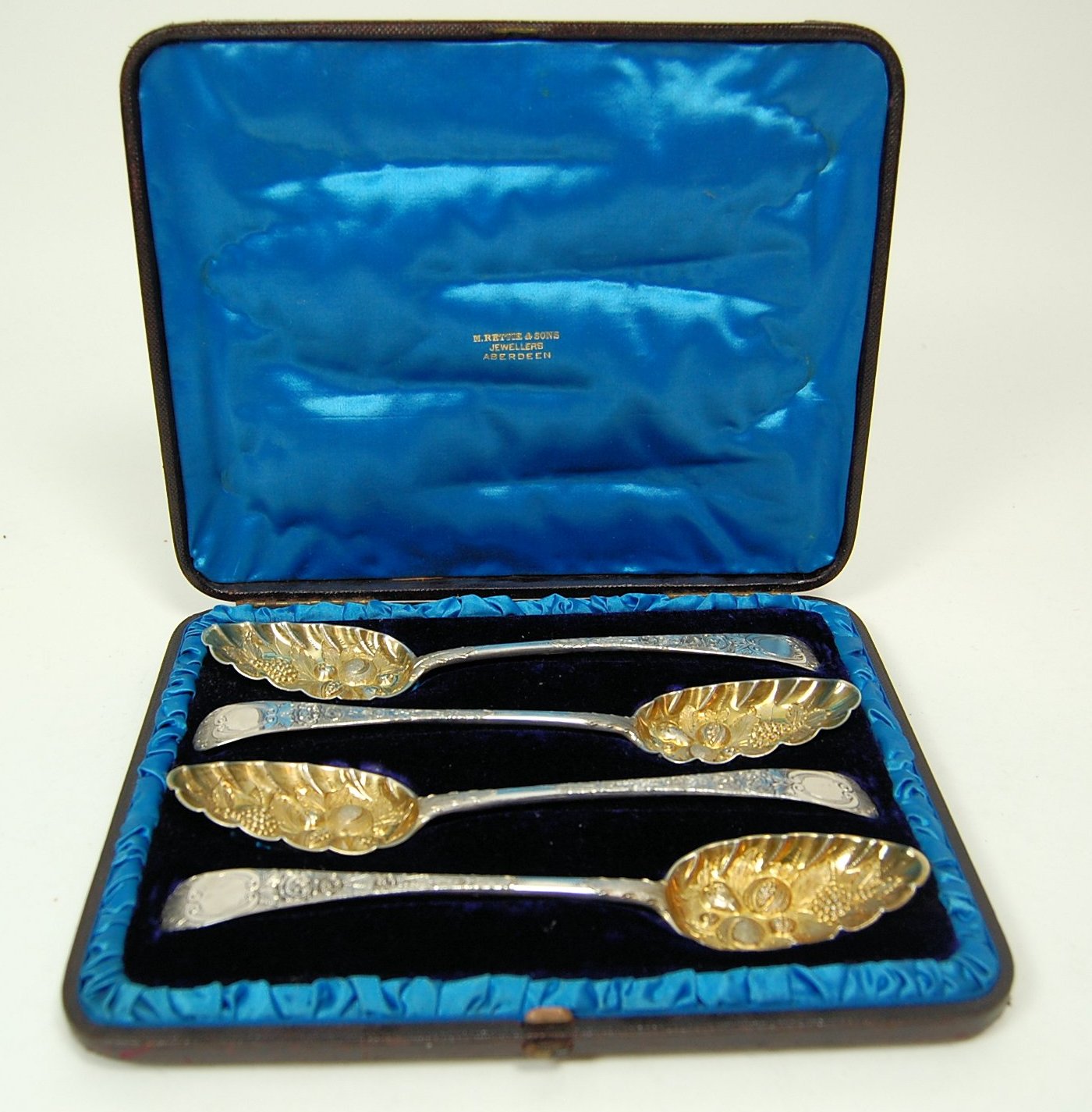 John Leslie, marked IL, thistle (incuse), omega of Old English pattern with embossed stems and fruit to gilt bowls, in fitted case inscribed 'M Rettie & Sons Jewellers Aberdeen'