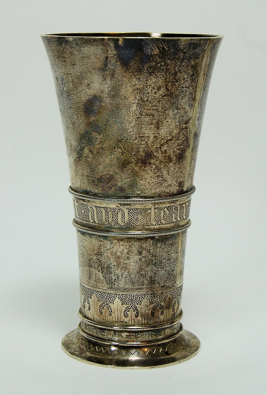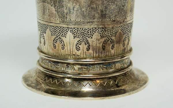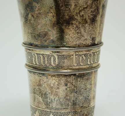 Hamilton & Inches, Edinburgh 1882, of tapered cylindrical form with reeded girdles and engraved motto 'Do Richt and Fear Nocht', the lower section of the body with engraved acanthus leaves and presentation inscription, on a simple foot