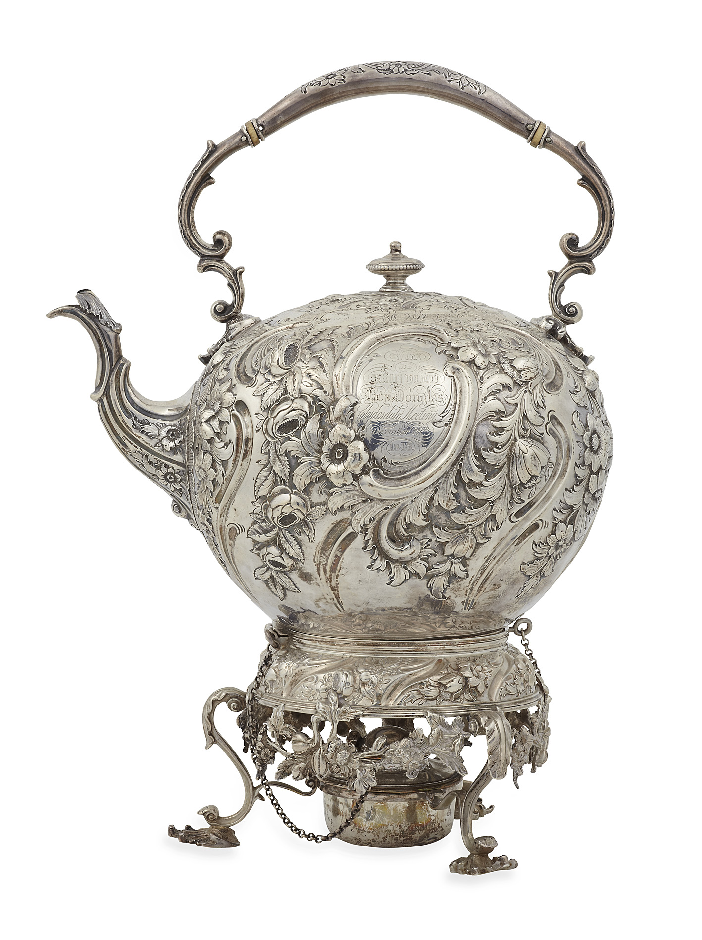 Marshall & Sons, Edinburgh 1842, the spherical body with foliate and flower head decoration with twin scroll formed cartouches, one enclosing engraved armorial the opposing inscribed 'won by Brindled Lady Douglas Clydesdale Meeting December 28th 1843', with short curved spout and foliate handles, raised on a tripod base with S scroll supports joined by pendant swags