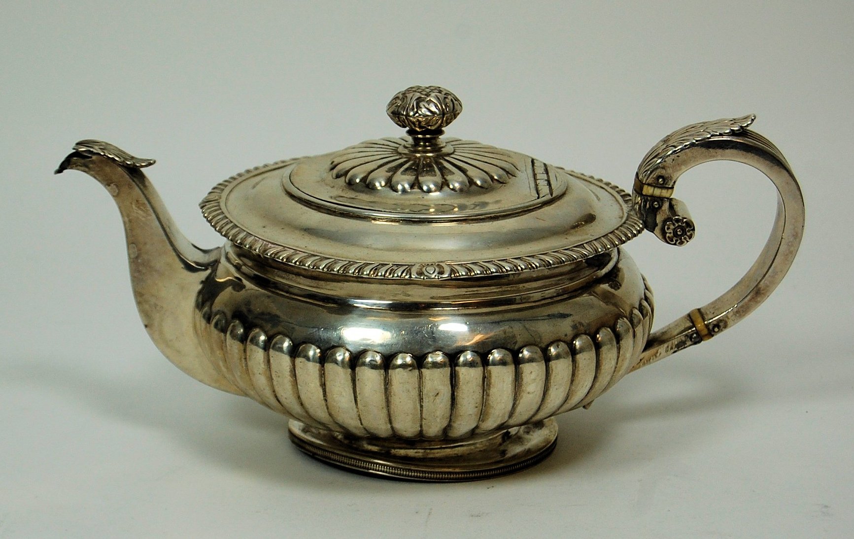 George McHattie, Edinburgh 1816, of compressed form with gadrooned lower section and cover, with curved spout and handle, repairs (A/F)