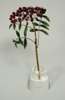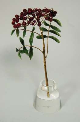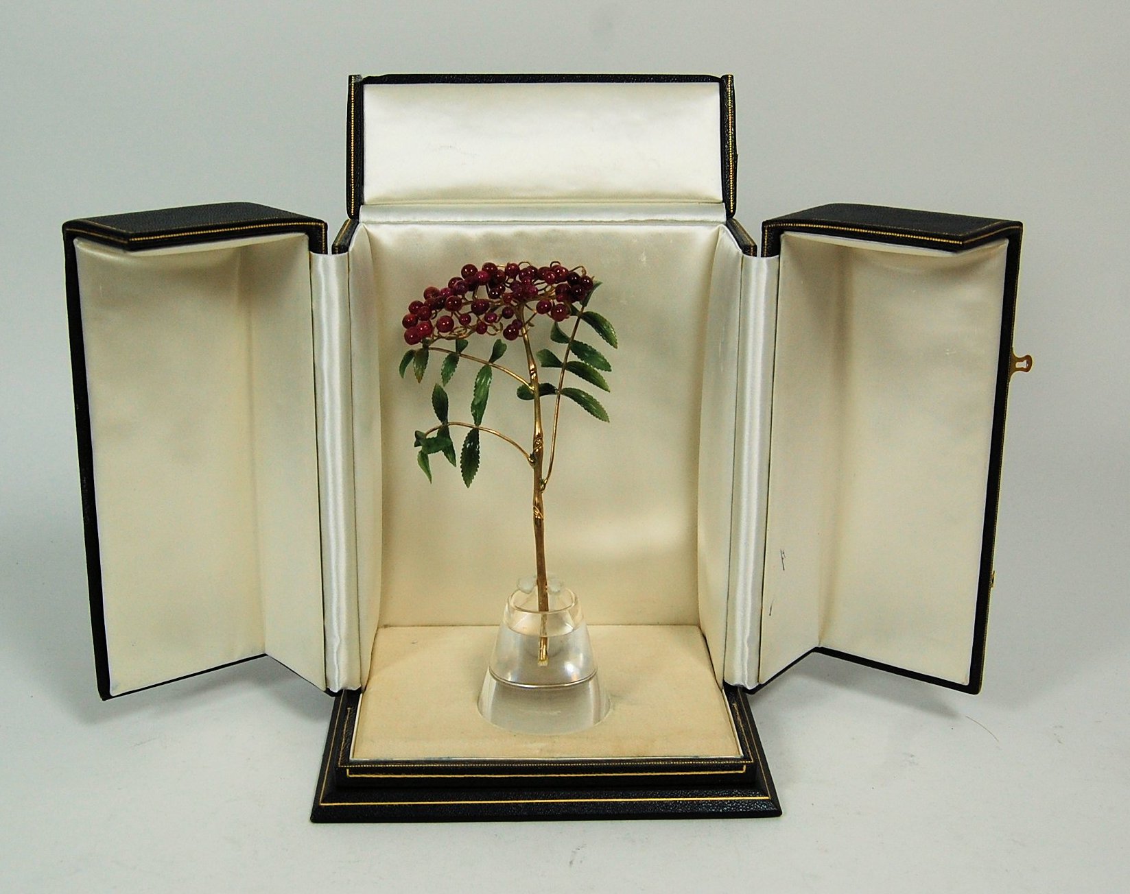 the silver gilt stem and branches holding jadeite carved leaves and with polished ruby bead berries, resting in a simple glass vase with simulated water, in fitted two swing door cabinet with gilt tooling