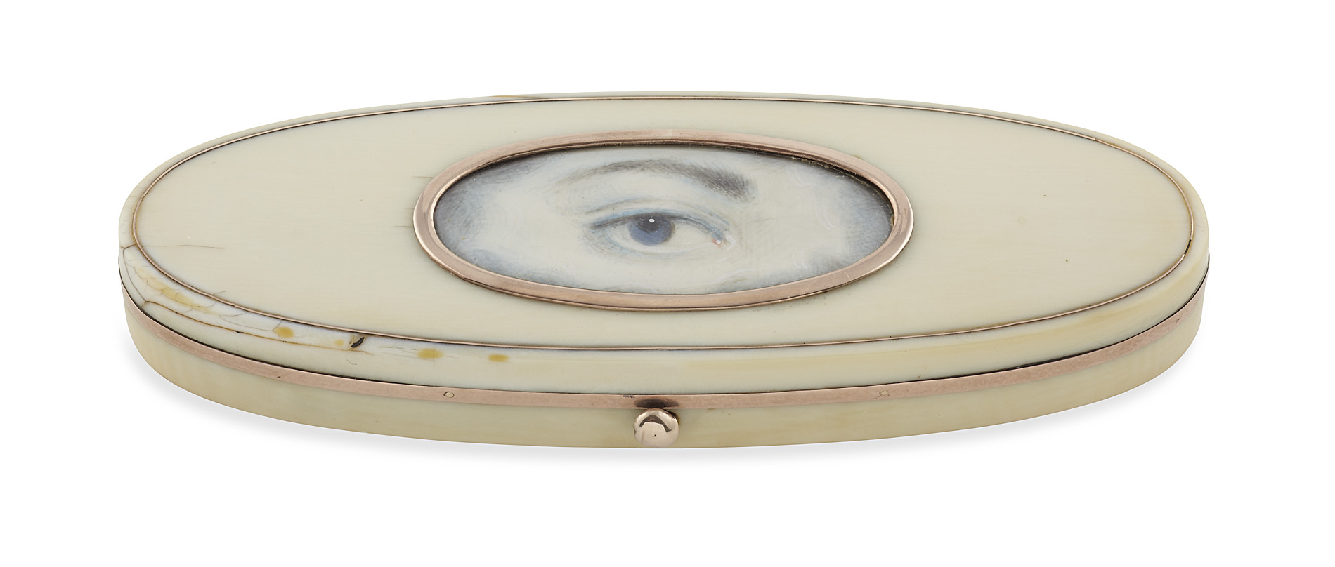 to rounded rectangular ivory box with simple gold mounts and inlay, the hinged cover set with gold frame with water color of an eye on ivory behind a glass panel, the interior lined with velvet