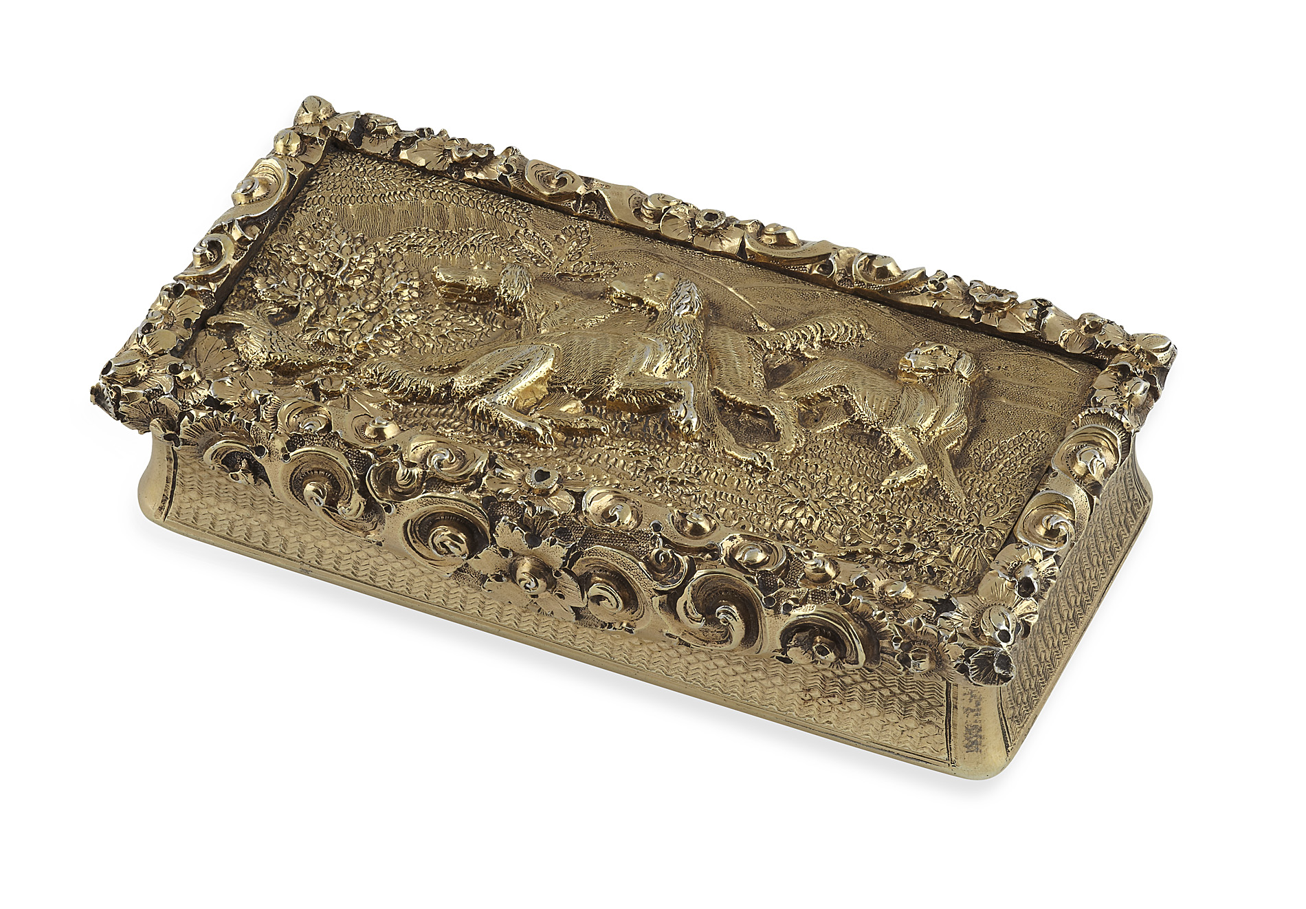 Birmingham 1834, of rectangular outline, the lid with cast and chased decoration of hounds and foliage in relief, with cast foliate border and thumbpiece, the body and base with engine turned decoration