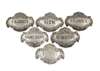 marks indistinct, of cartouche form, the borders chased with scrolls, grapes and lions masks with pierced lettering reading 'OLD PORT', 'GIN', 'CLARET' (X2), 'BURGUNDY', 'GOLDEN SHERRY' (6)