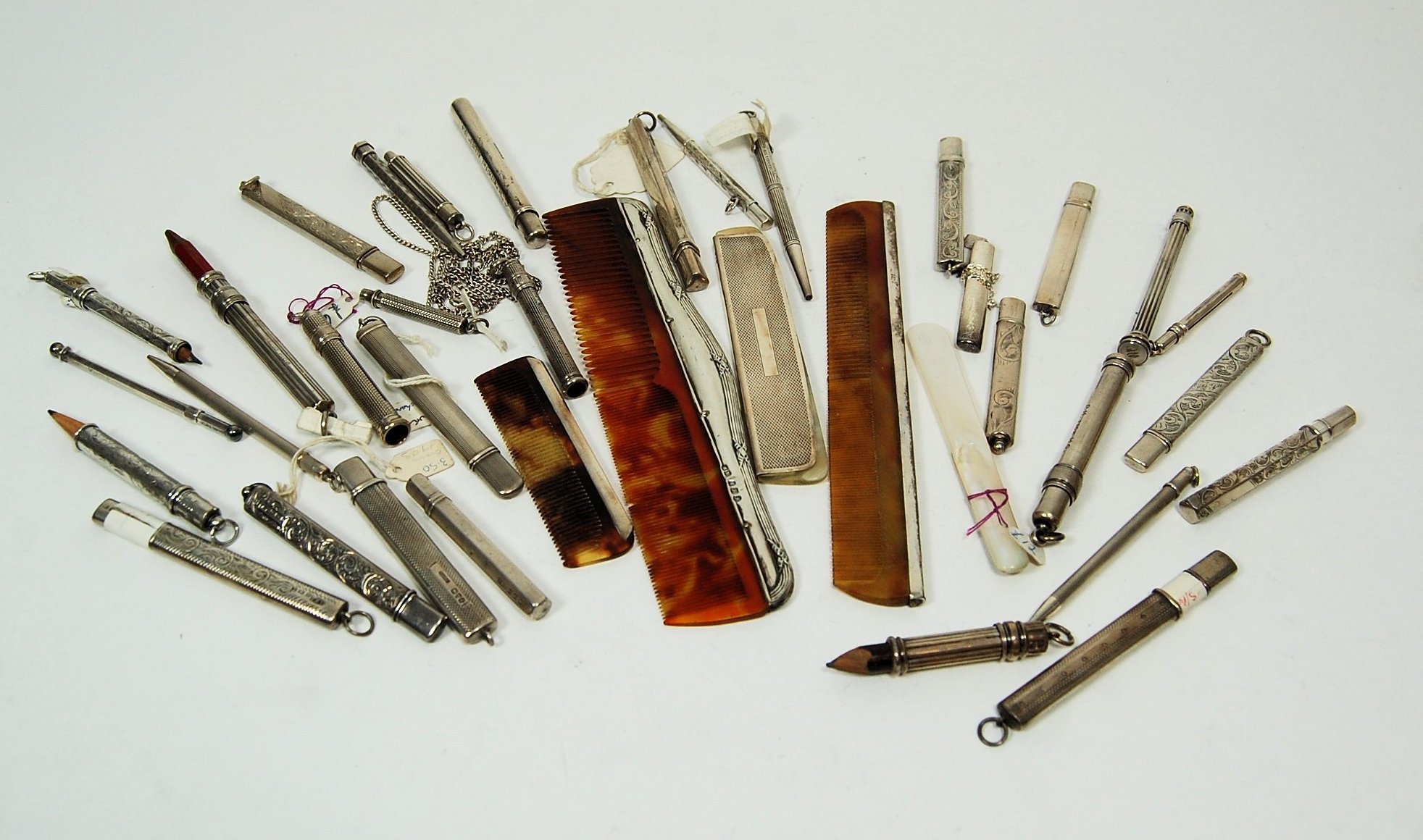 various dates and makers, to include engine turned examples, reeded and engraved etc, various patterns and styles; together with a small number of novelty items including comb covers, tooth picks etc (qty)