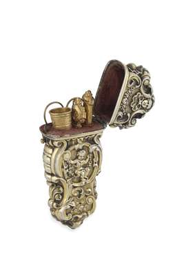 ALPH GEROUX, of shaped outline with rococco scroll formed borders with cherub, masks and floral displays within, the hinged cover with push button release revealing gilt tools to interior, comprising needle case, bodkin, thimble, scissors