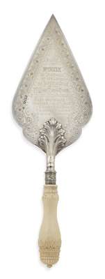 Charles Boyton, London 1902, the shaped triangular blade with engraved zig zag and foliate border enclosing presentation inscription 'Presented to Mrs Meek on the occasion of her laying the Foundation Stone of the PJ Meek Nurses House at the Clock & Watch Makers Asylum, New Southgate November the 14th 1903.....', with foliate detailed socket attachment to finely carved baluster ivory handles, in original fitted case