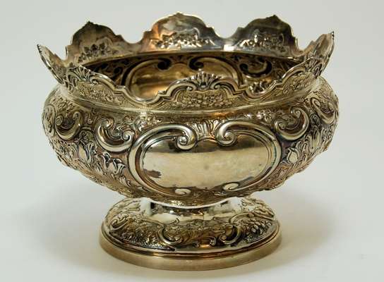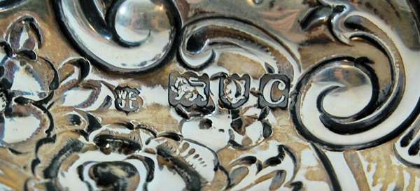 London 1898, the shouldered body with scalloped rim, both with embossed floral and scroll decoration, on a short stem and domed foot