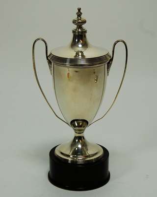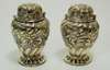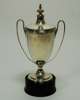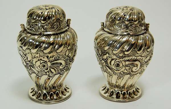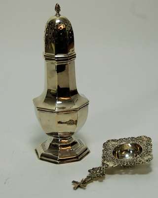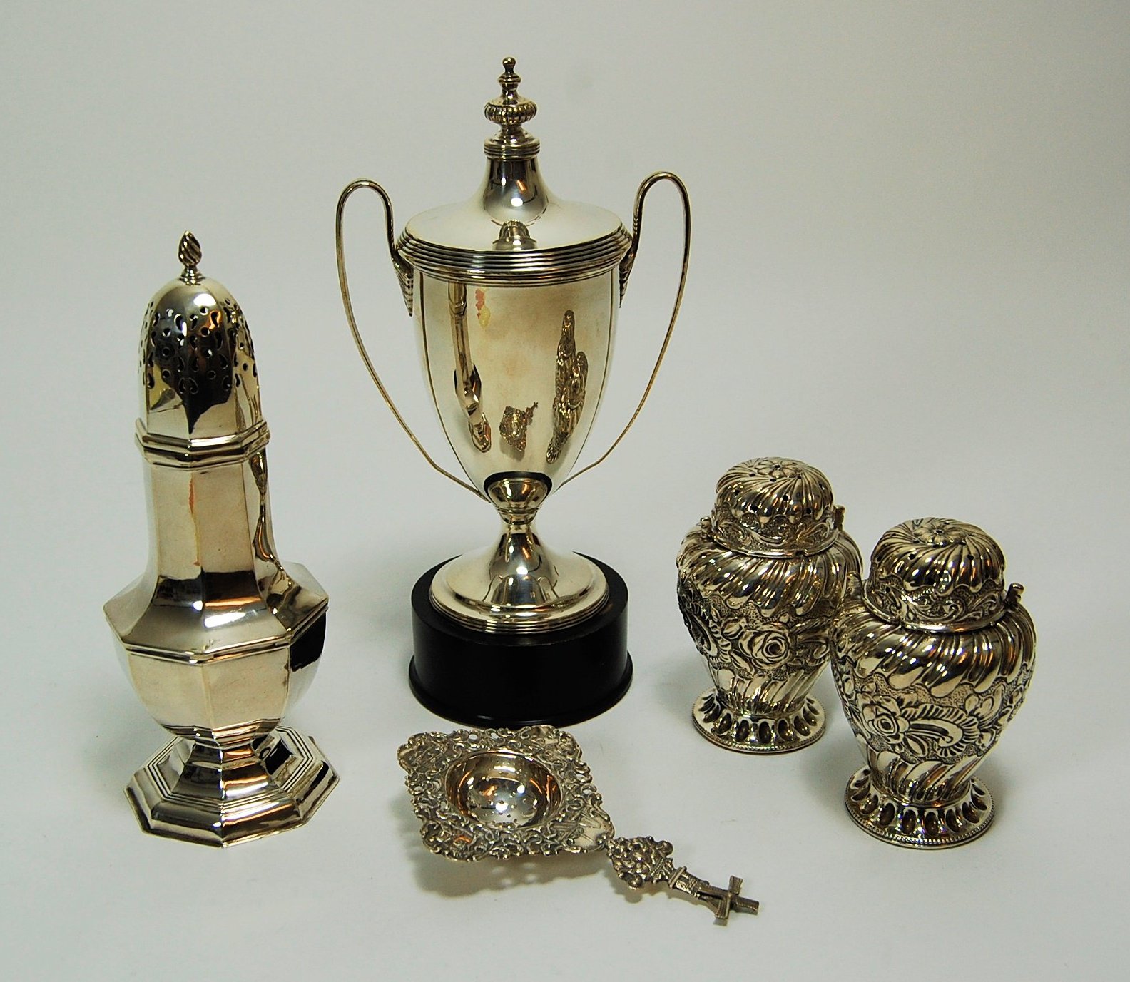 London 1885, of bombe form with floral and scroll decorations with pierced domed covers; together with an octagonal sugar caster, a trophy cup on stand and a Dutch strainer spoon (5)