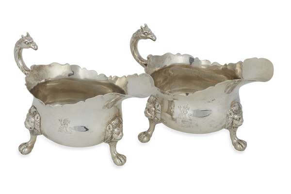 Lambert, London 1878, of large George II style with everted scalloped rim and spout with griffin head formed handle and lion mask feet (2)