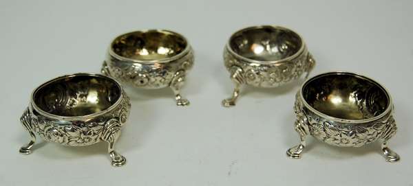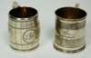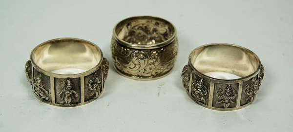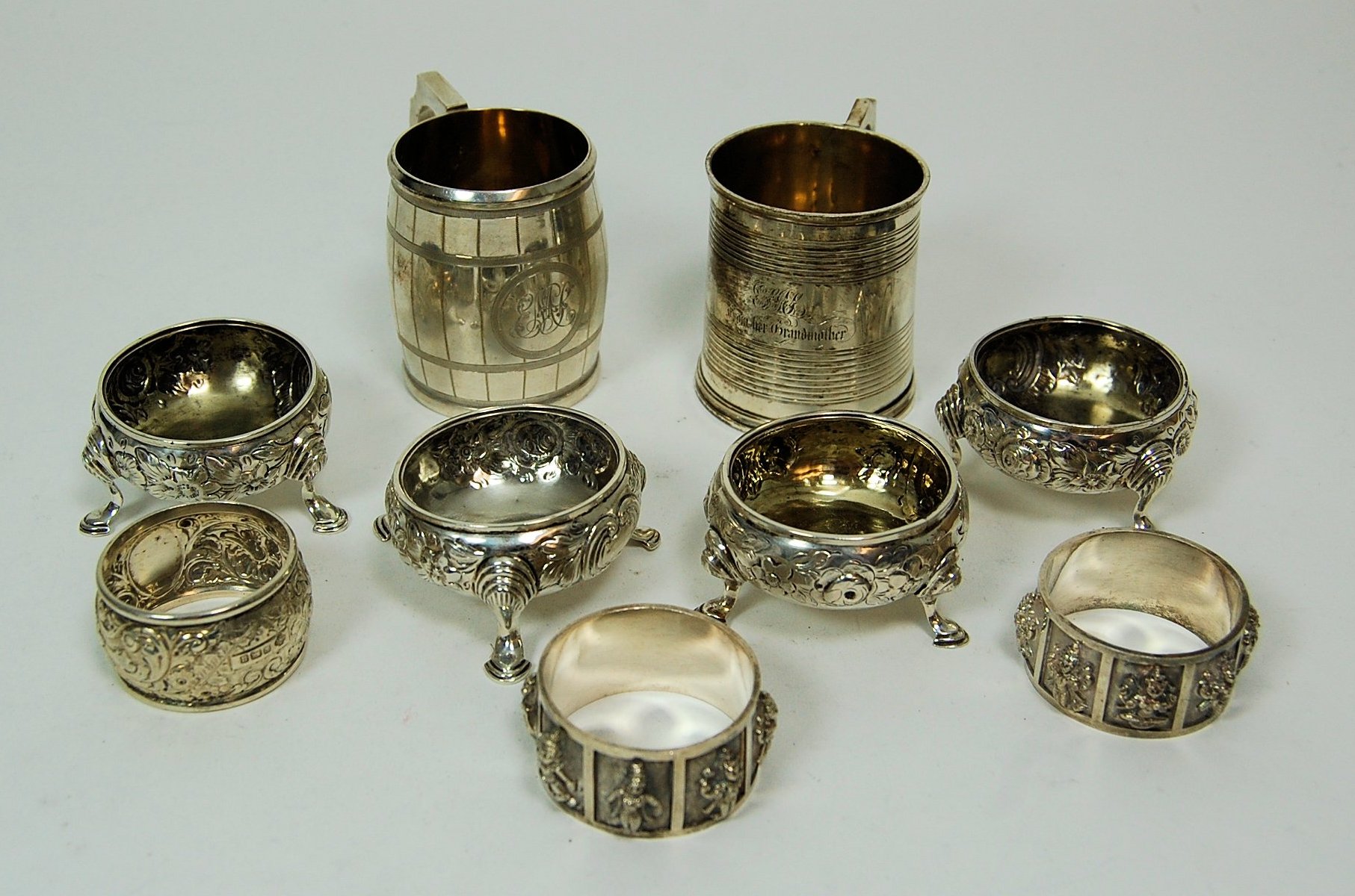 George Adams, London 1873, of barrel form with wriggle engraved decoration; together with another similar with reeded decoration and a set of four open salts; also to include two Indian white metal napkin rings (qty)