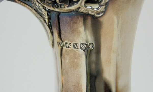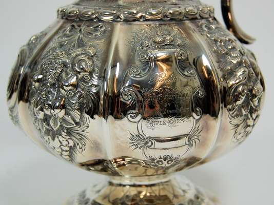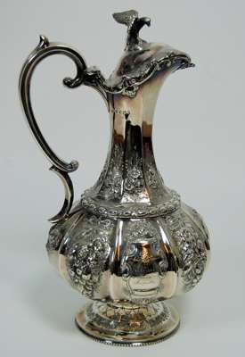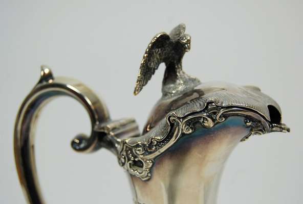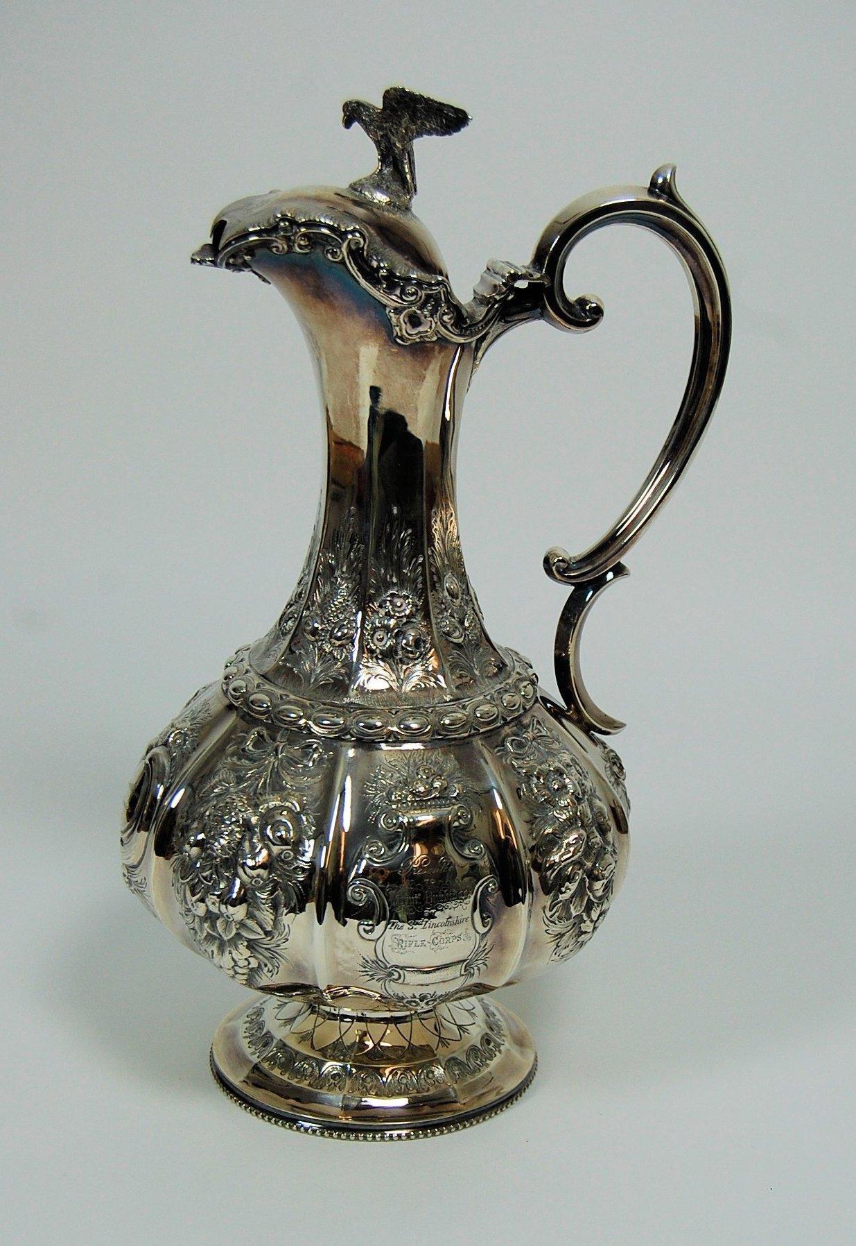 Sheffield 1863, of slender baluster from with fluted body with embossed panels of displayed flowers, with scroll formed cartouche, the hinged cover with eagle finial and S scroll handle