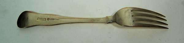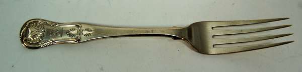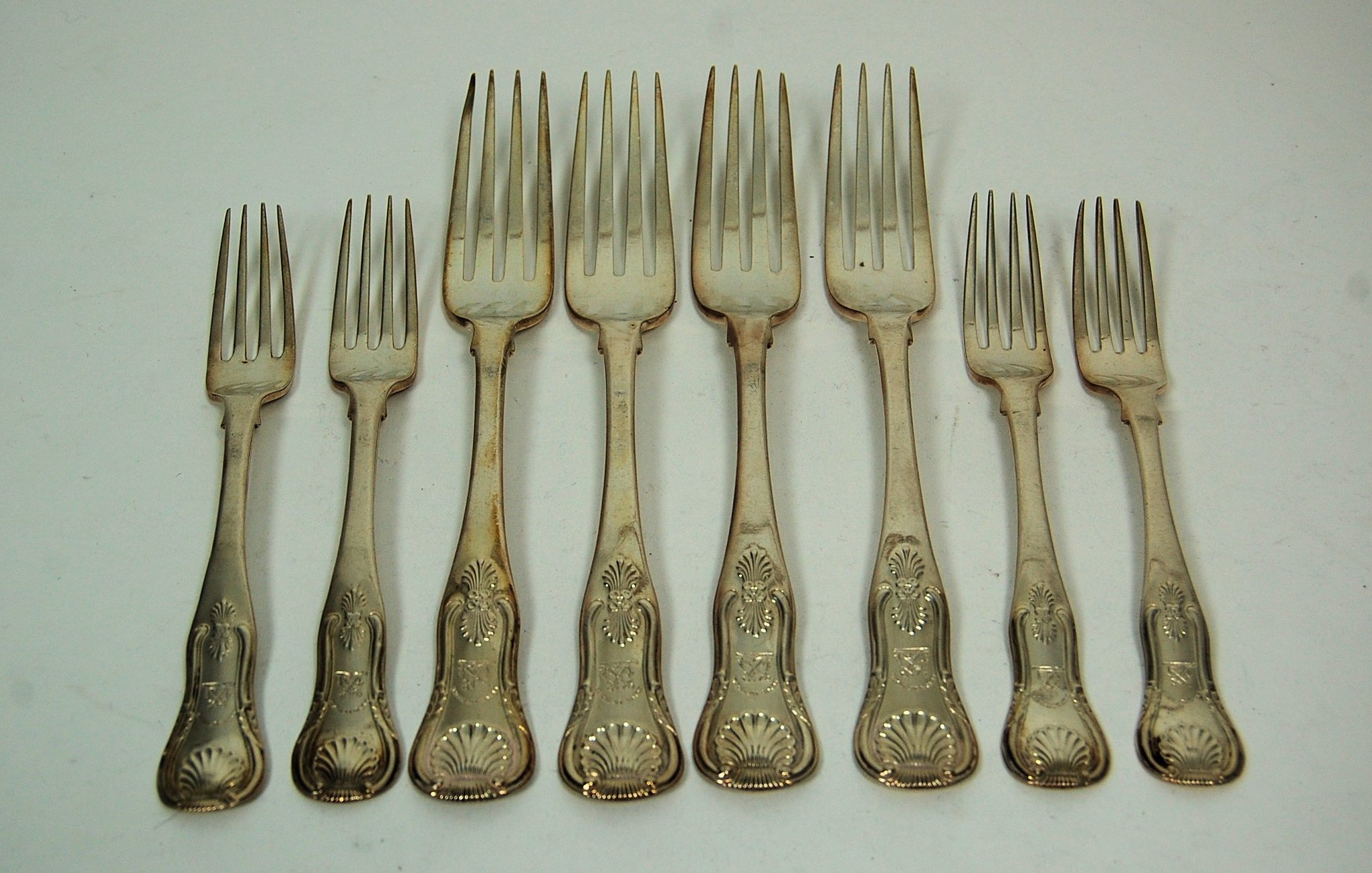 Edinburgh 1825, of single struck Queen's pattern with engraved crest and motto, to include table forks, dessert forks, sugar tongs etc (qty)