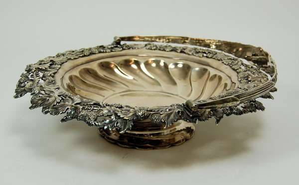 London 1822, of shaped circular outline with fluted bowl and pieced and cast fruiting vine border, the swing handle similarly decorated, raised on a shaped foot