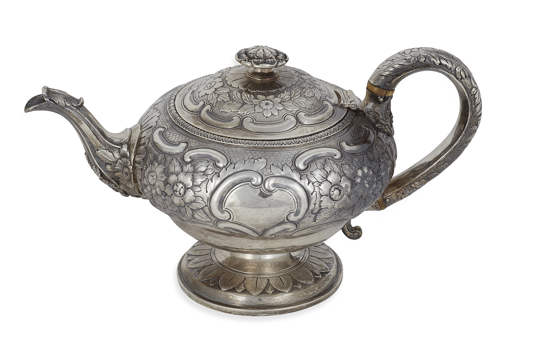 London 1818, of compressed inverted pear shaped form with profusely decorated floral and scroll decoration and short fluted spout, with C scroll handle and spreading foot