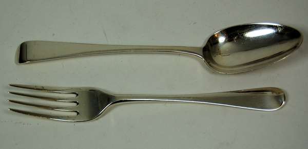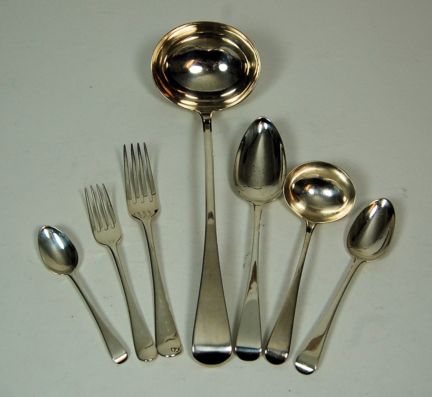 Richard Crossley, predominantly London 1805, of Old English pattern with vacant terminals, comprising twelve each of, table forks, dessert forks, tablespoons, dessert spoons, teaspoons, also to include a pair of sauce ladles and a soup ladle (qty)