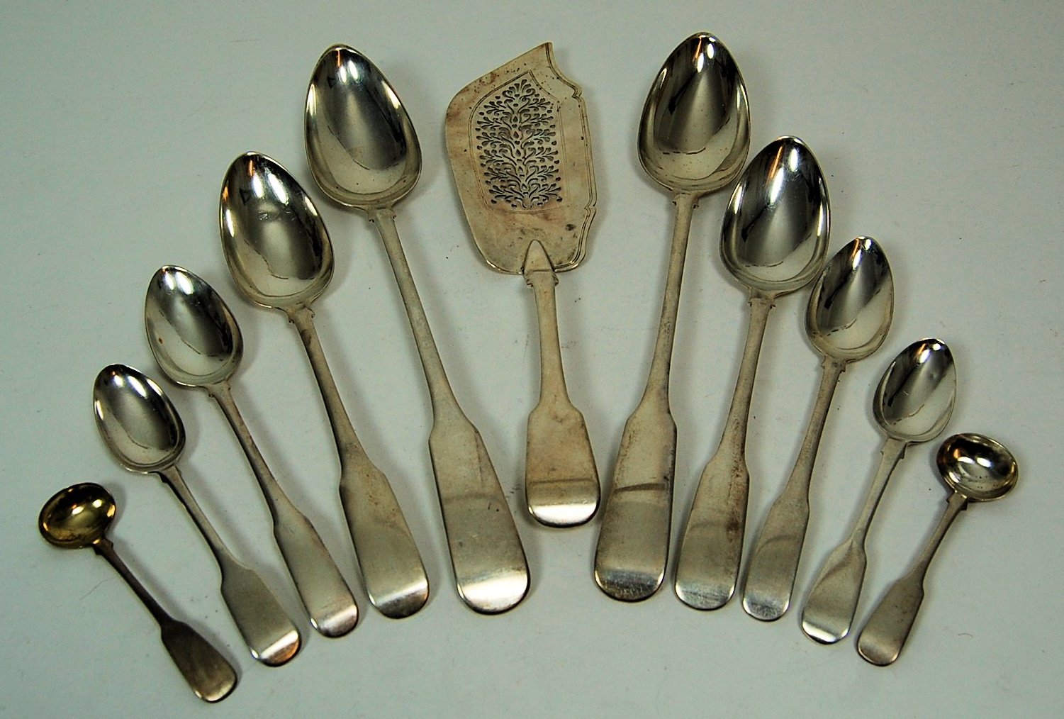 various dates and makers, to include fish slice, serving spoons, dessert spoons, forks, etc (qty)