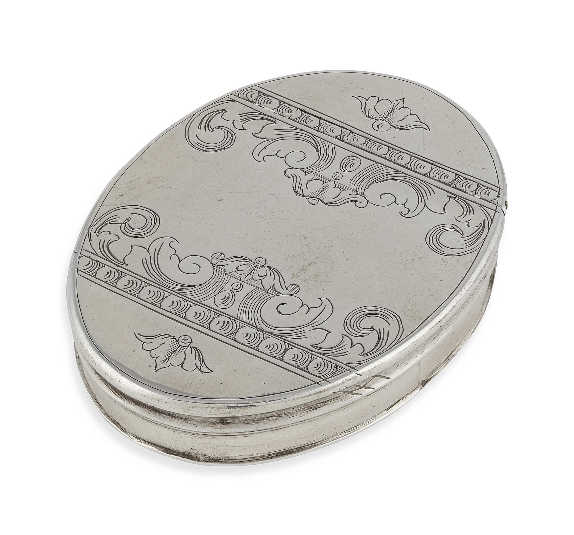 makers mark only, ?S (first initial unclear) of oval outline with engraved borders and scroll work to cover, with flush hinged three quarter opening