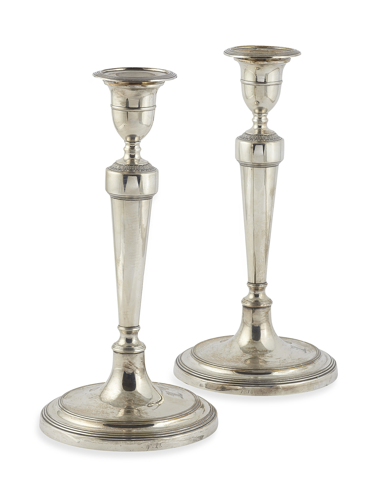 J Parsons & Co, Sheffield 1784, the simple tapered columns with acanthus border below sconce and raised on a reeded rim, domed foot (3)