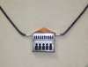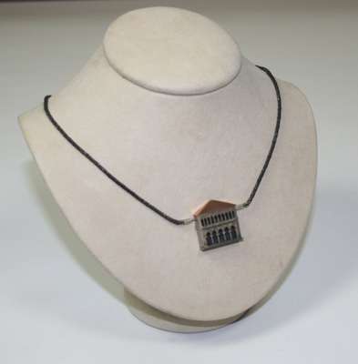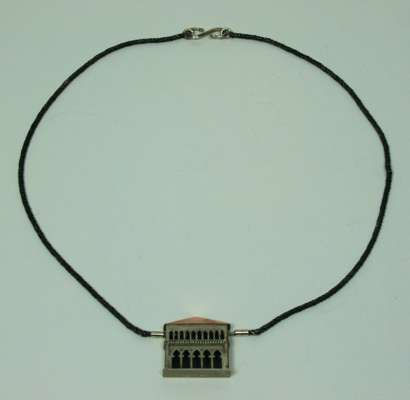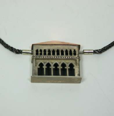 the pendant designed as an Italianate building with pierced arches and windows, modelled in silver and copper, to a twisted oxidised white metal chain