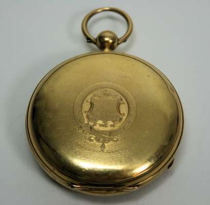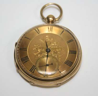 Chester 1875, the enhgraved gilt dial with engraved floral detail and roman numerals, with subsidiary seconds dial, blued hands, engine turned decorated case, the movement engraved Gordon and Sons, Wolverhampton