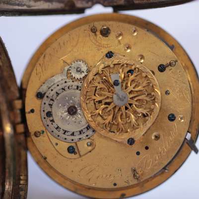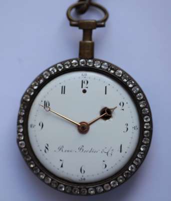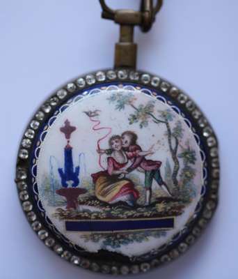 the circular enamel dial with Arabic numerals, inscribed Roux Bordier et Cie, paste set border, the rear cover with enamelled vignette of a couple in a garden setting, similar paste border, the verge movement similarly inscribed, numbered 15165, the whole suspended from a similar period gilt metal chatelaine clip