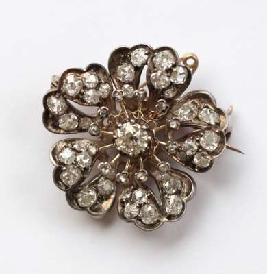 of naturalistic design, set throughout with graduated old mine and rose cut diamonds, with hinged pin and safety chain